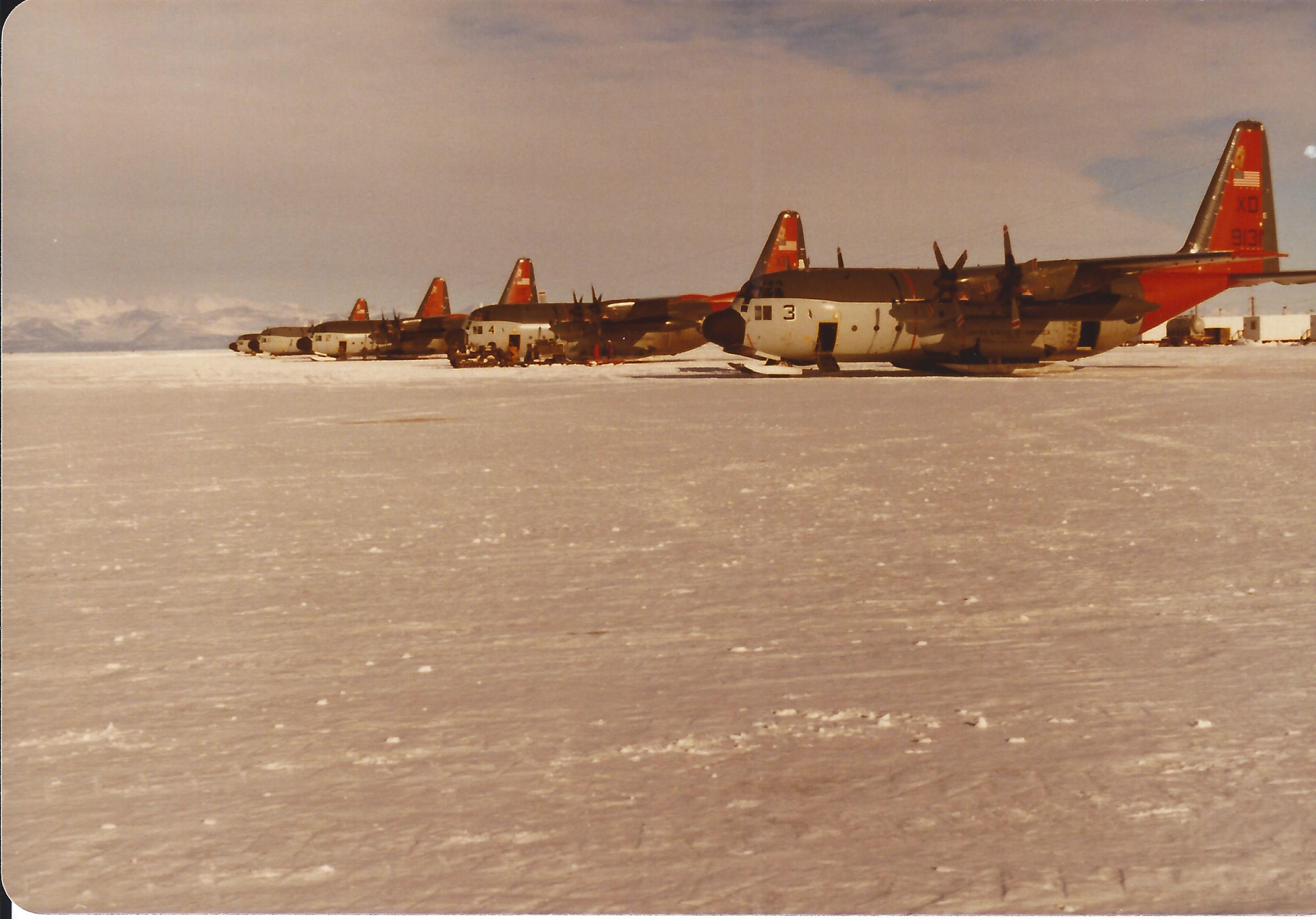 A view of five LC-130\'s at William\'s Field, McMurdo Station, Antarctica in January, 1982.